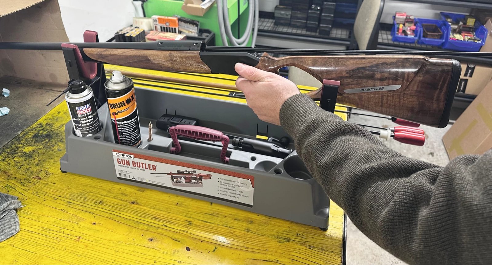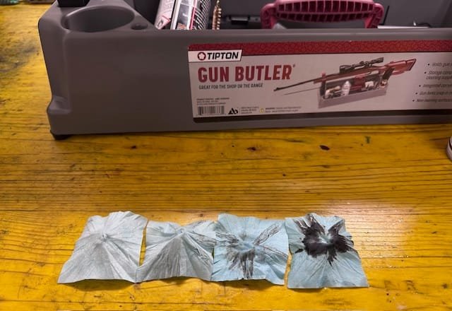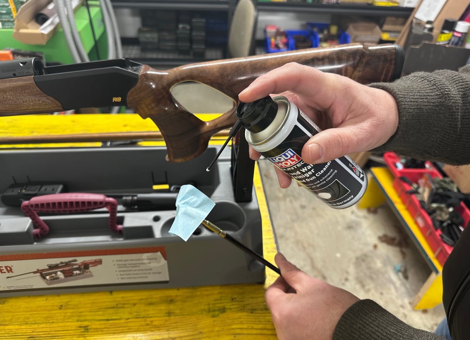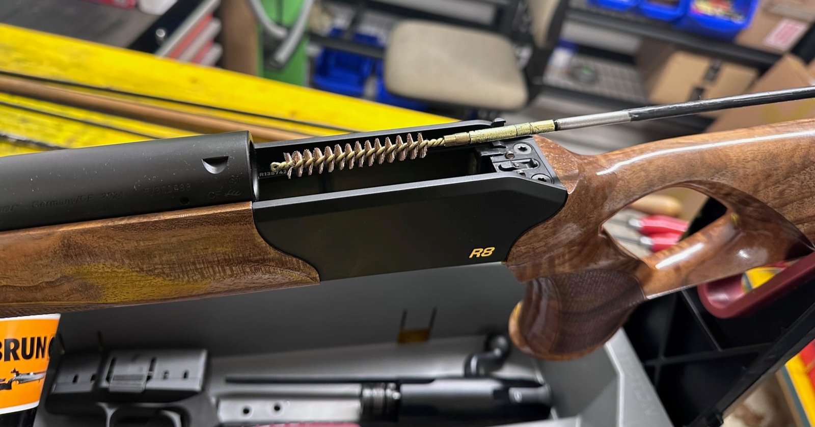 - Laufreinigungswerkzeug: Schnellreinigungsschnur, Putzstock mit kugelgelagertem Griff, Messing-/Bronzebürsten im richtigen Durchmesser, Laufreinigungs-Solvent flüssig oder Paste, Textilpatches/Filzpfropfen)