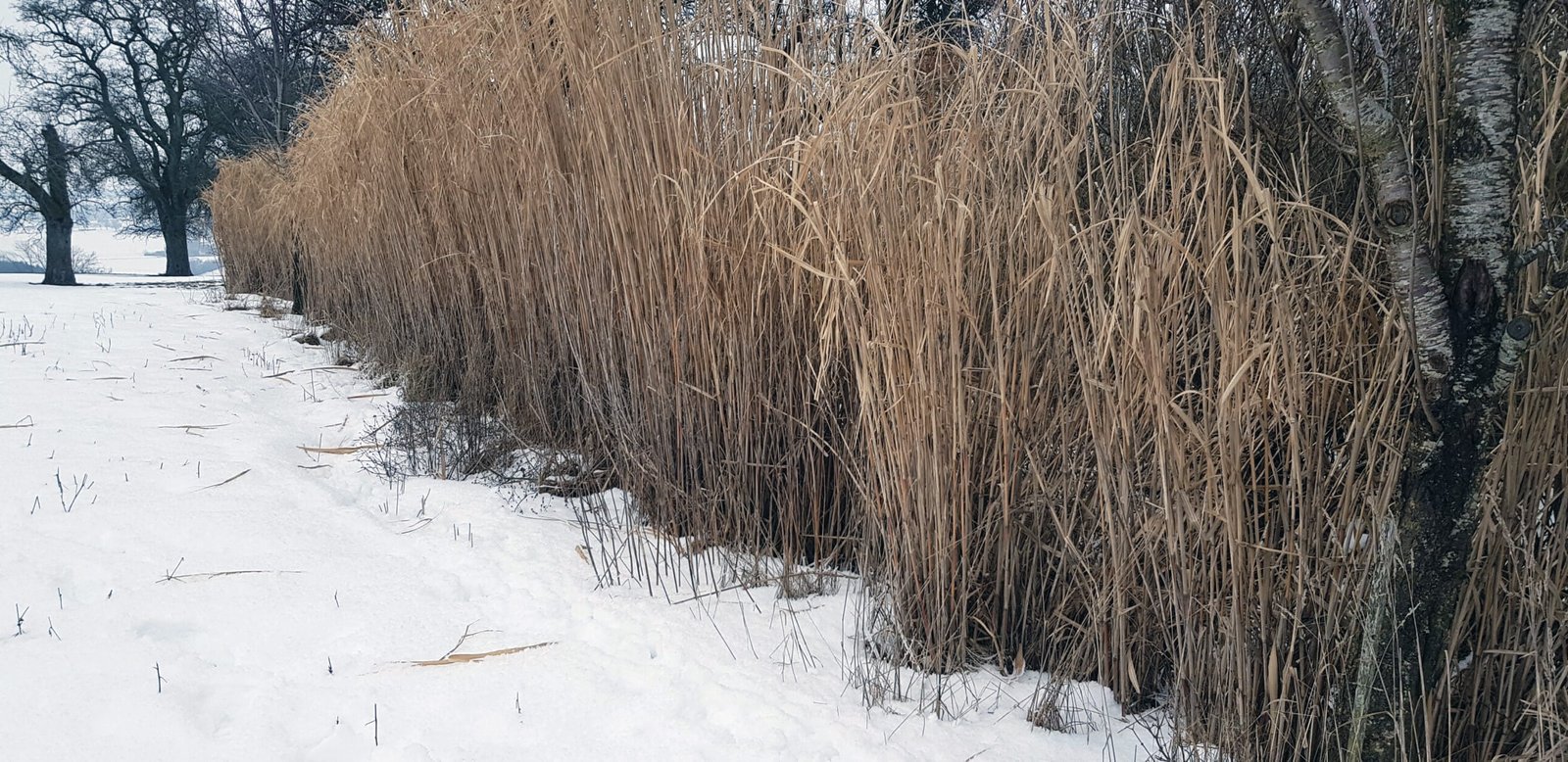 Der Schnee knirscht unter unseren Stiefeln, während wir zum ersten Biotop-Element gehen. An einem sanften Hang hat David Schoder ein Biotop geschaffen, das ihn stolz macht. Er zeigt auf eine Dickung, die sich an die Landschaft anschmiegt. Auf der Windseite hat er einen Streifen Elefantengras gepflanzt. Das bietet dem Wild viele Vorteile: Schutz vor dem Westwind, der den Hang entlangweht, Sichtschutz und die Möglichkeit, von dort aus die vorgelagerten Wiesen bzw. Äcker zu beobachten. Wir finden viele Betten und Losung, die bestätigen, dass die Rehe das gerne nutzen. Und selbst im Jänner ist gut zu sehen, wie in der Wand, die aus den getrockneten Stängeln gebildet wurde, viele Wechsel und Schlupflöcher in die Dickung dahinter führen. Nicht nur Rehe, auch Hasen und Fasane nutzen das, wie der Schnee verrät. Und auch für Meister Reinecke scheint das interessant zu sein. Schoder grinst verschmitzt: „Das zeigt mir, dass wir ein interessantes Biotop geschaffen haben, wenn es für alle passt, oder?“