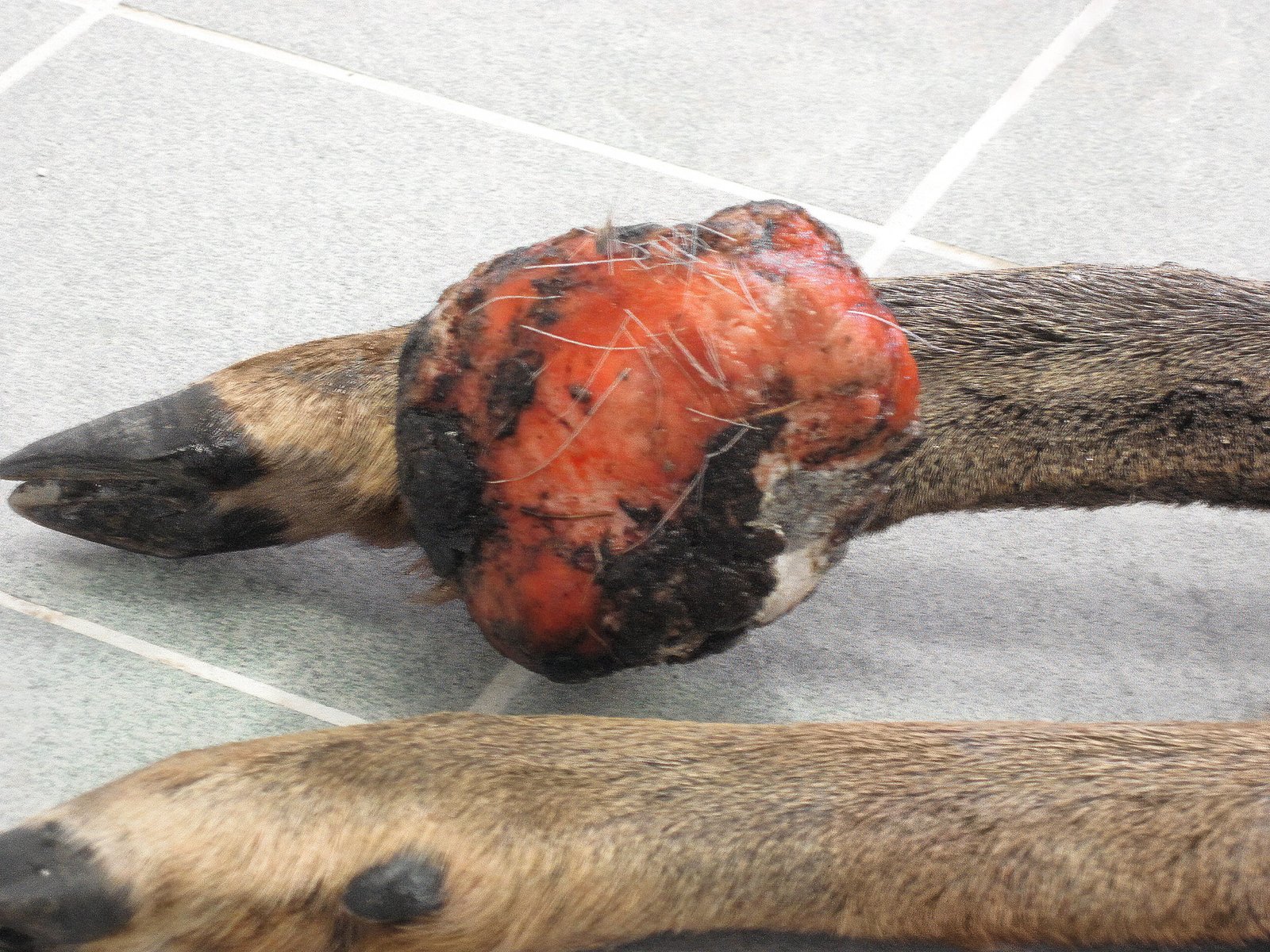 Es handelt sich um eine virusbedingte Infektionskrankheit, mit der zungenbrecherischen Bezeichnung „Fibropapillomatose“, ausgelöst durch das Delta-Papillomavirus (CcPV-1). Dabei entstehen normalerweise gutartige Bindegewebswucherungen in der Haut. Diese Knoten sind oft dunkelgrau bis schwärzlich pigmentiert, meistens haarlos und können sowohl einzeln als auch in großer Zahl am ganzen Körper auftreten – besonders häufig treten diese Umfangsvermehrungen an den Läufen, am Bauch oder am Haupt der Tiere auf. Doch Vorsicht! Nicht jede Umfangsvermehrung ist auch tatsächlich ein Fibropapillom, denn es könnte sich z. B. auch um Schwellungen durch entzündliche Prozesse, wie bakterielle Infektionen (Abszesse), (alte) Knochenbrüche, Hämatome (Blutergüsse) und Tumoren anderer Genese, handeln.